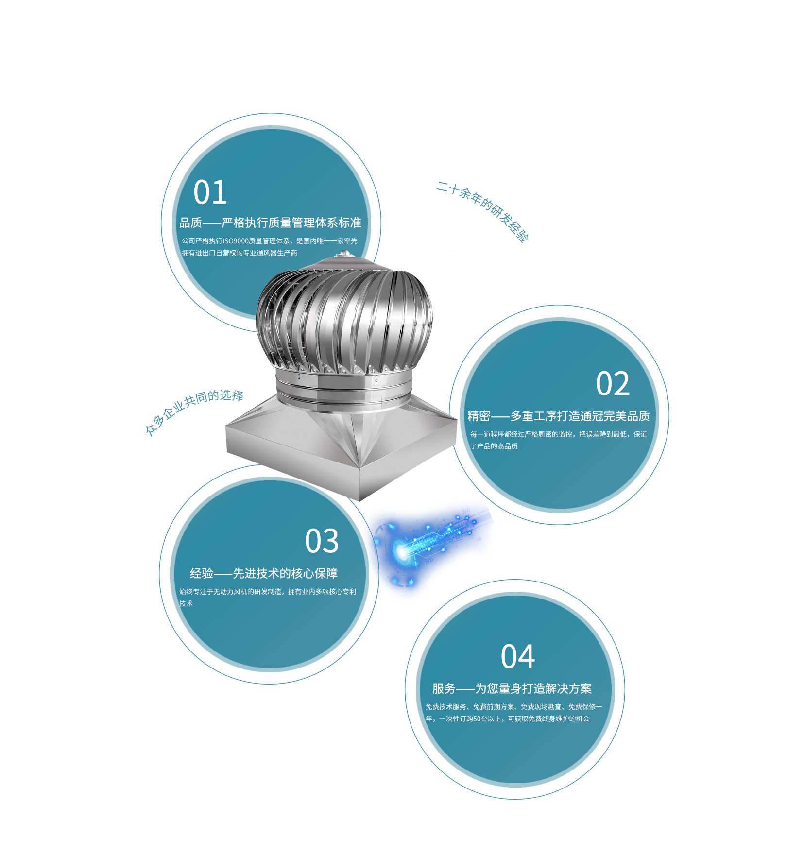 天長(zhǎng)市通冠無動(dòng)力風(fēng)機(jī)有限公司,是集研發(fā)、生產(chǎn)、銷售于一體的,專業(yè)無動(dòng)力風(fēng)機(jī)生產(chǎn)廠家。公司坐落于205國道南京與揚(yáng)州之間,位于省級(jí)高新經(jīng)濟(jì)技術(shù)工業(yè)園,交通便利。“通冠”有著一支技術(shù)精湛、服務(wù)非凡的隊(duì)伍。所有一線技術(shù)工人技術(shù)熟練、質(zhì)量意識(shí)強(qiáng)。公司嚴(yán)格執(zhí)行ISO9000質(zhì)量管理體系,一貫貫徹“以質(zhì)量為生命”、“以信譽(yù)為根本”、“以服務(wù)為基礎(chǔ)”的理念···[查看詳細(xì)]